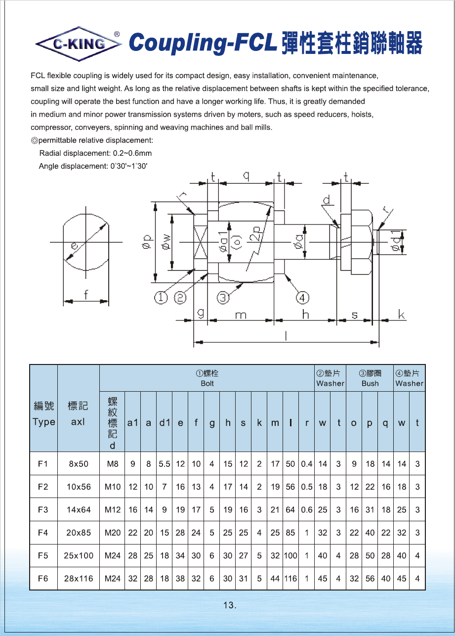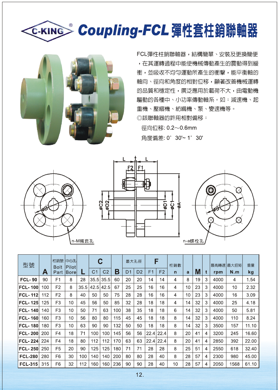FCL弹性柱销聯軸器 1. 由高級鑄鐵材質製成。 2. 橡膠材質為NBR 。